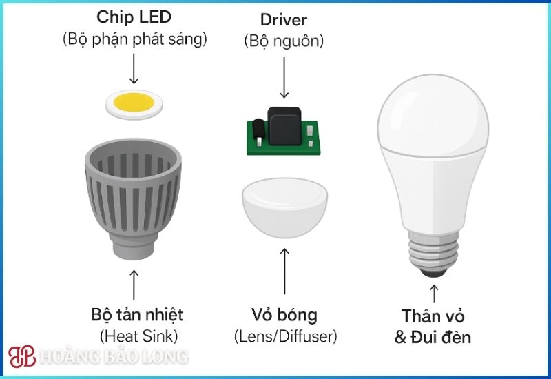 Một Bóng Led Bulb là một tổ hợp hoàn chỉnh gồm 5 bộ phận chính sau: