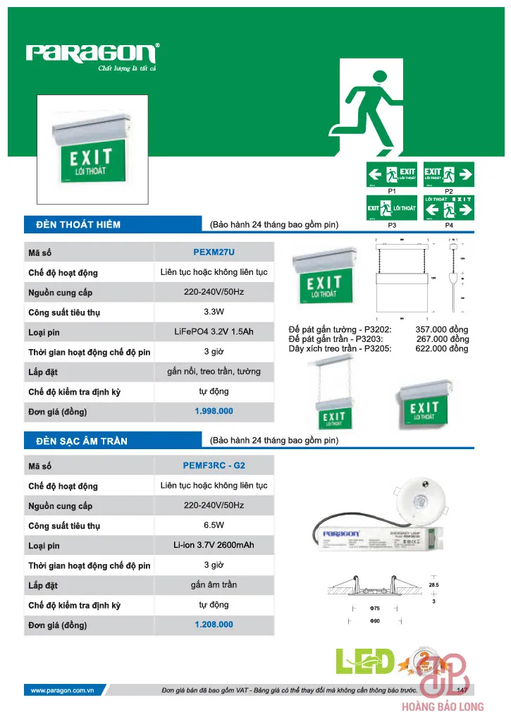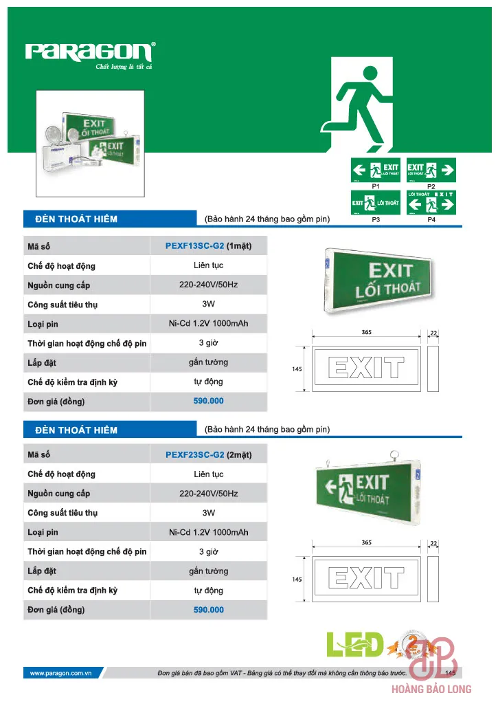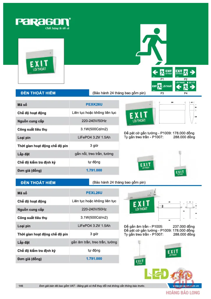 Sản phẩm tiêu biểu & Thông số kỹ thuật Đèn Exit Paragon