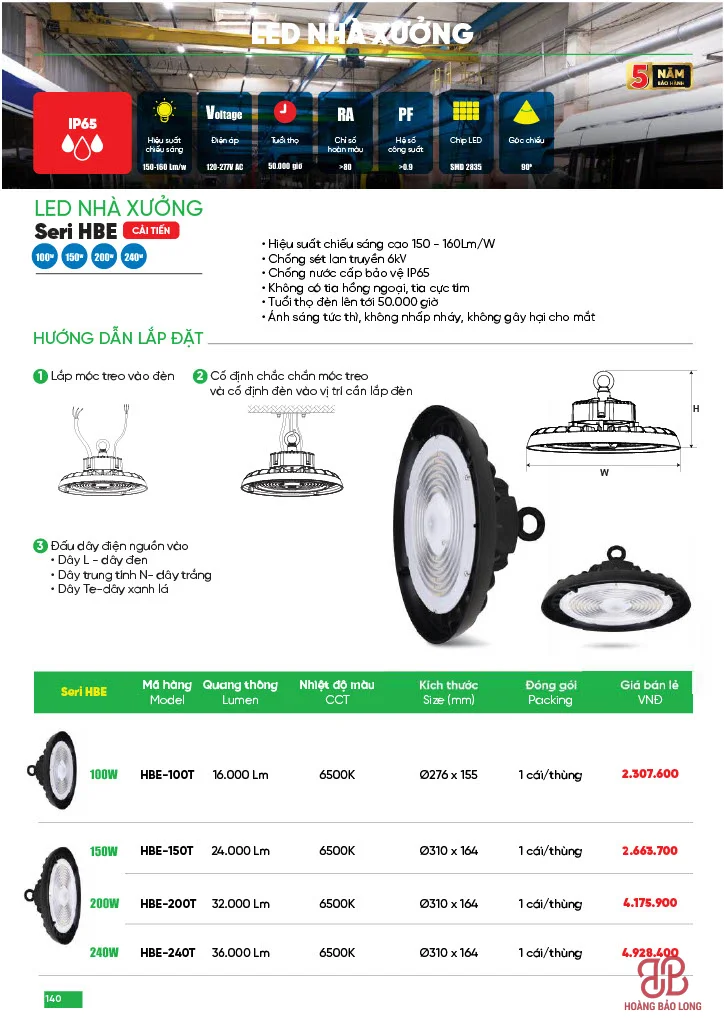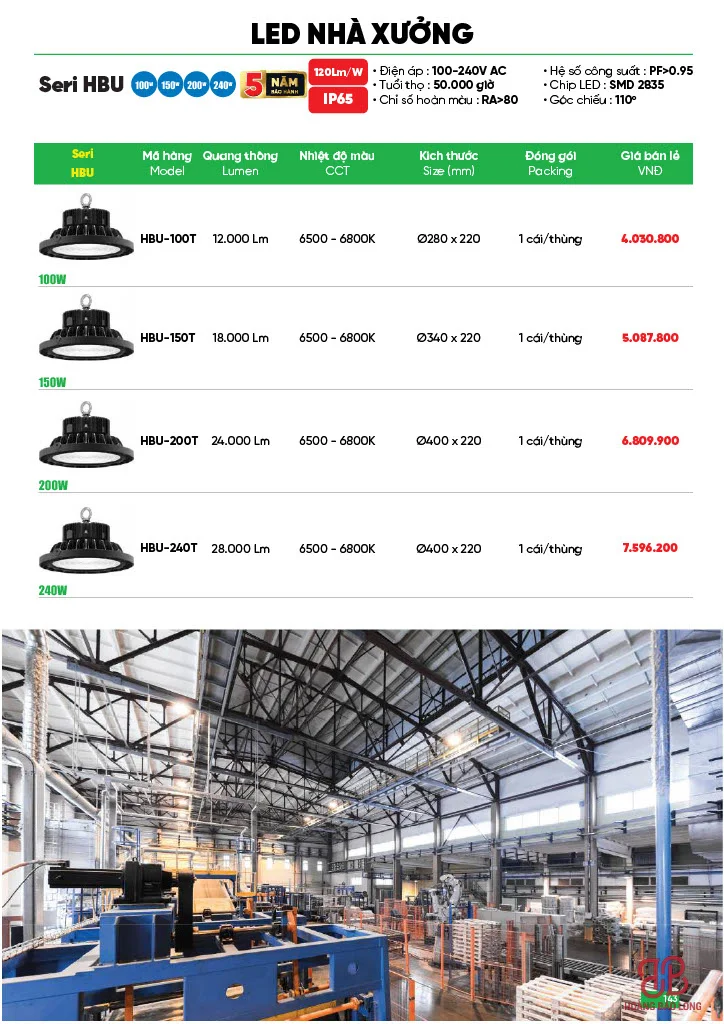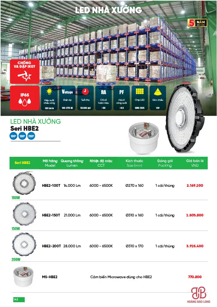 Dòng HBE là đèn LED nguyên khối (Highbay) có hiệu suất cao (160 Lm/W), chống nước IP65 và tuổi thọ 50.000 giờ. Dòng HBV là dạng bóng LED công suất lớn sử dụng đui đèn E40, thường dùng để thay thế bóng đèn cũ trong các chóa đèn có sẵn, tuổi thọ khoảng 30.000 giờ.