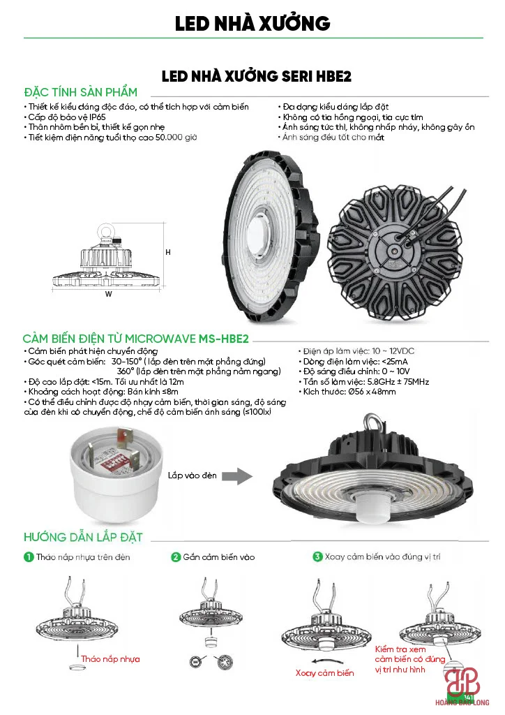 • Đặc điểm: Có thể lắp thêm cảm biến MS-HBE2 để điều chỉnh độ sáng, thời gian sáng khi có người chuyển động. Độ cao lắp đặt tối ưu lên đến 12m.