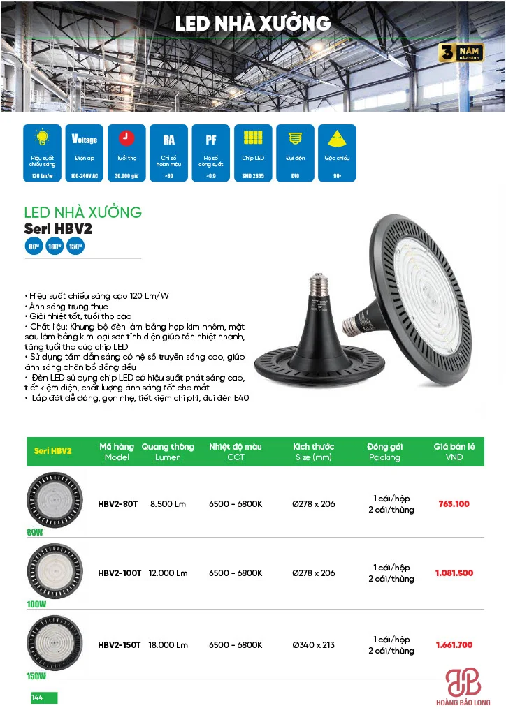• HBV2: Công suất 80W, 100W, 150W. Thiết kế khung nhôm, mặt sau kim loại sơn tĩnh điện giúp tản nhiệt nhanh.