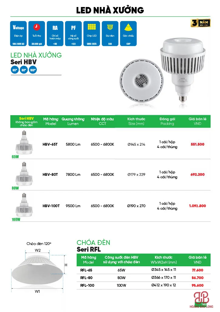 • HBV: Công suất 65W, 80W, 100W. Có thể kết hợp với chóa đèn RFL (góc chiếu 120 độ) để tăng hiệu quả chiếu sáng.