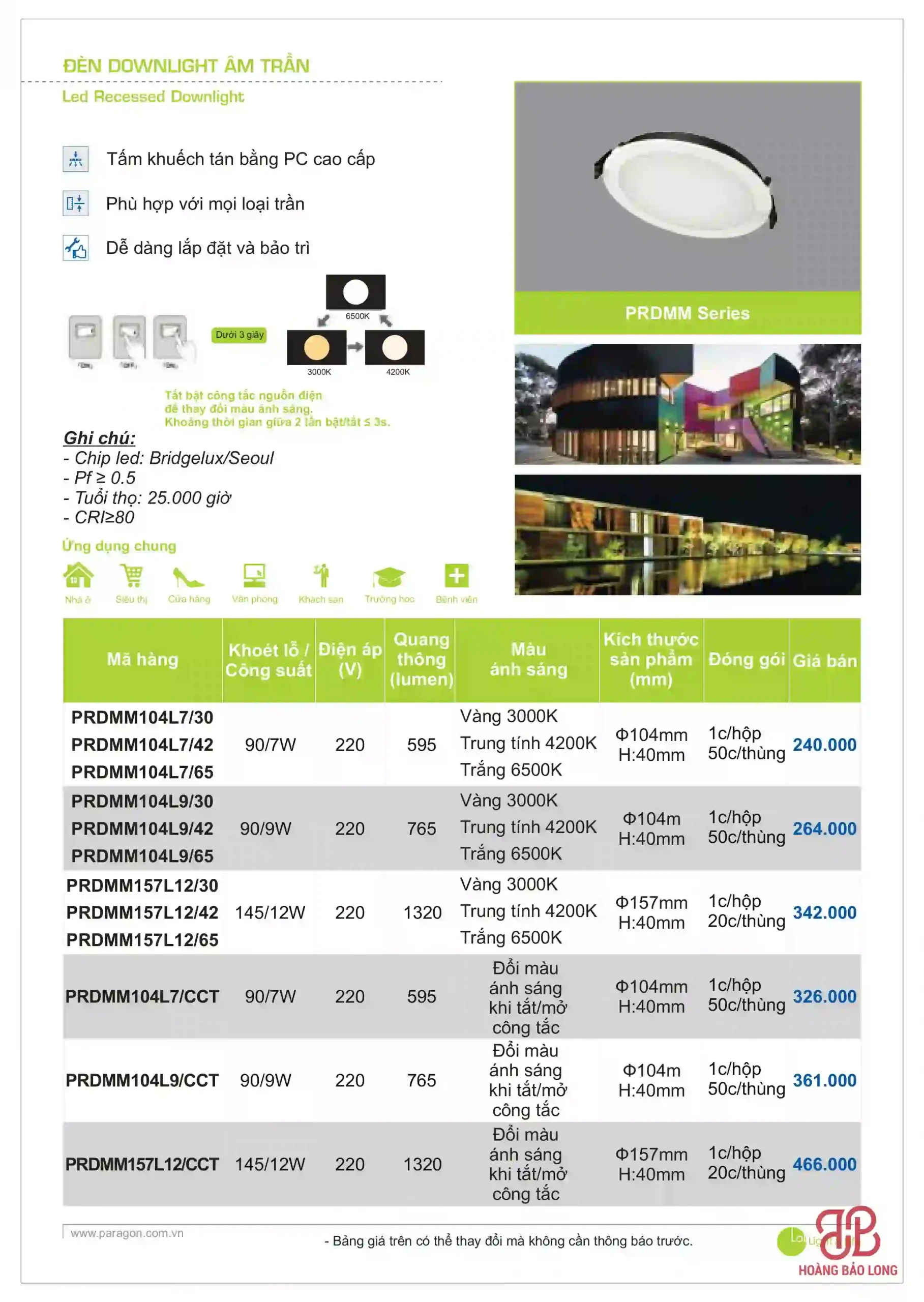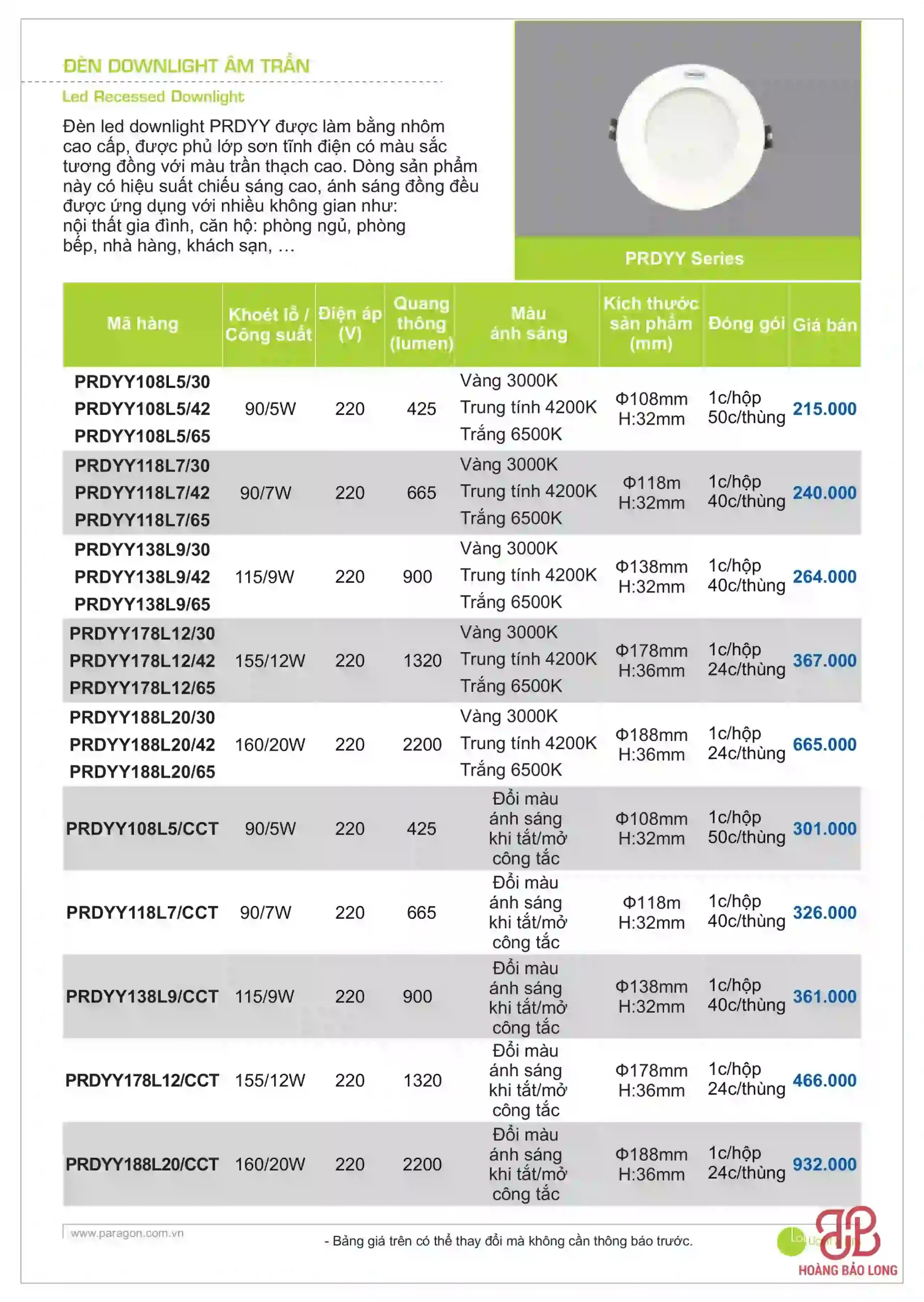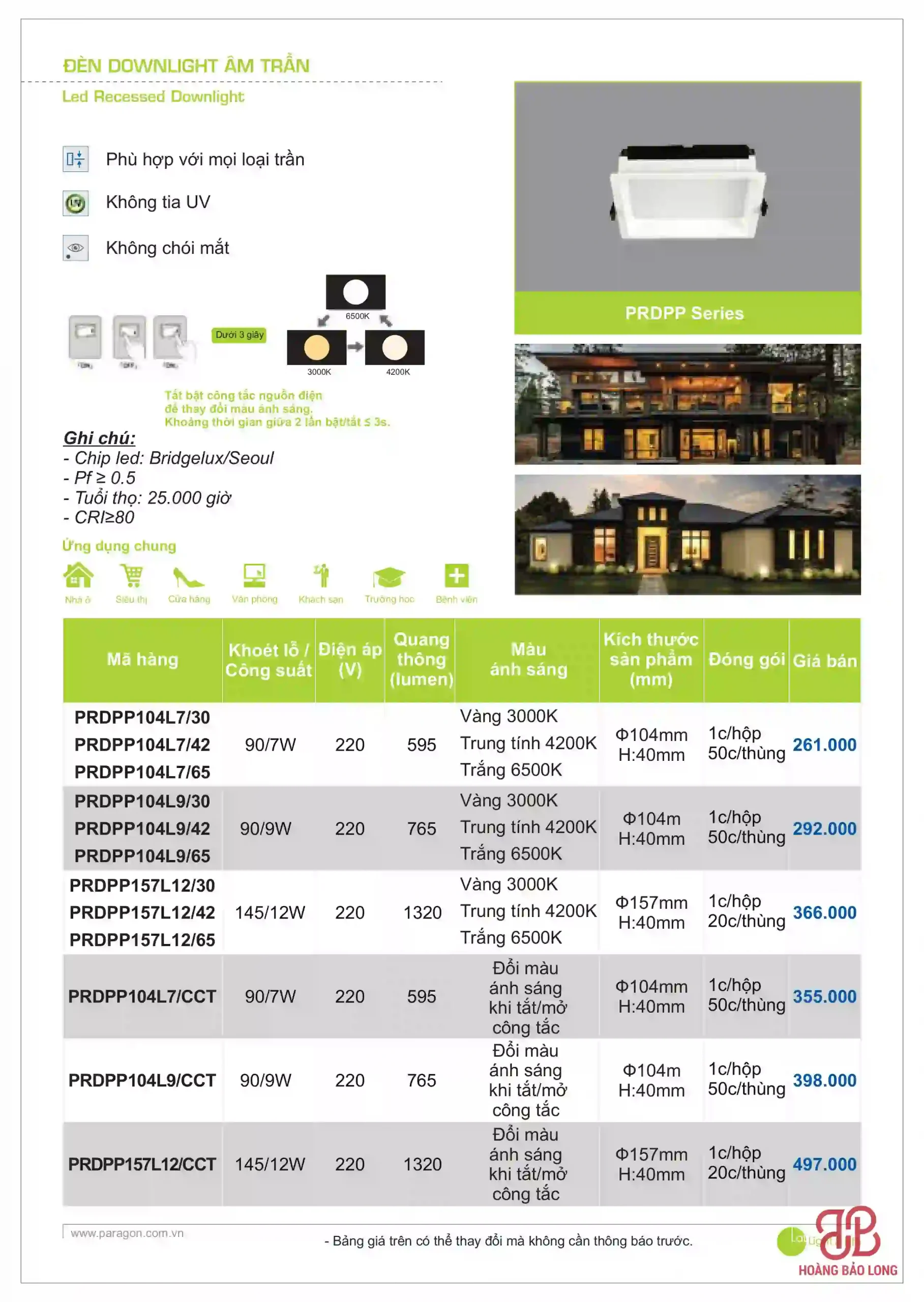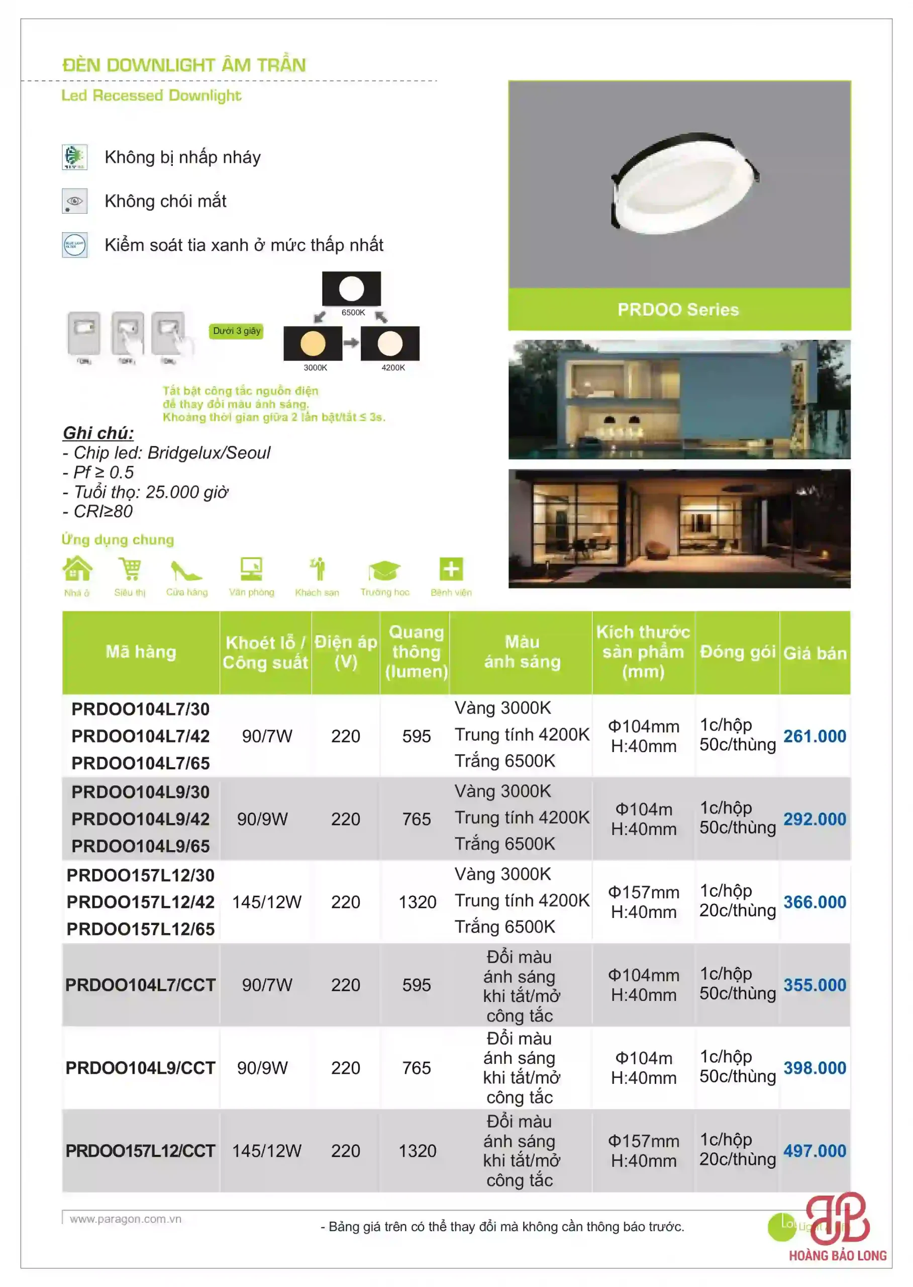 Đèn LED âm trần Paragon (hay còn gọi là LED Recessed Downlight) là dòng sản phẩm chiếu sáng chủ lực được tin dùng tại nhiều công trình cao cấp nhờ sử dụng chip LED từ các thương hiệu danh tiếng thế giới. Với tuổi thọ bền bỉ và chất lượng ánh sáng vượt trội, Paragon khẳng định vị thế hàng đầu trong phân khúc chiếu sáng dân dụng. Tại Hoangbaolong.net, chúng tôi cập nhật liên tục bảng giá và các mẫu đèn mới nhất từ Catalogue tháng 6/2025.