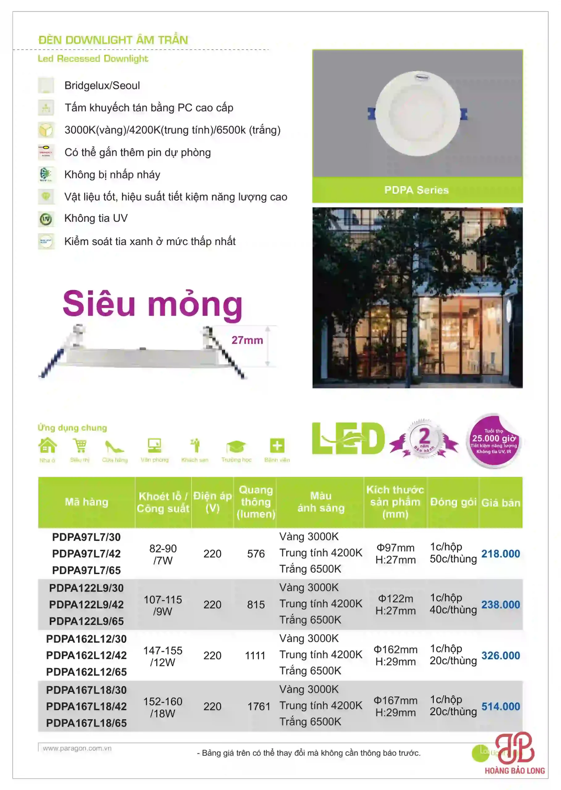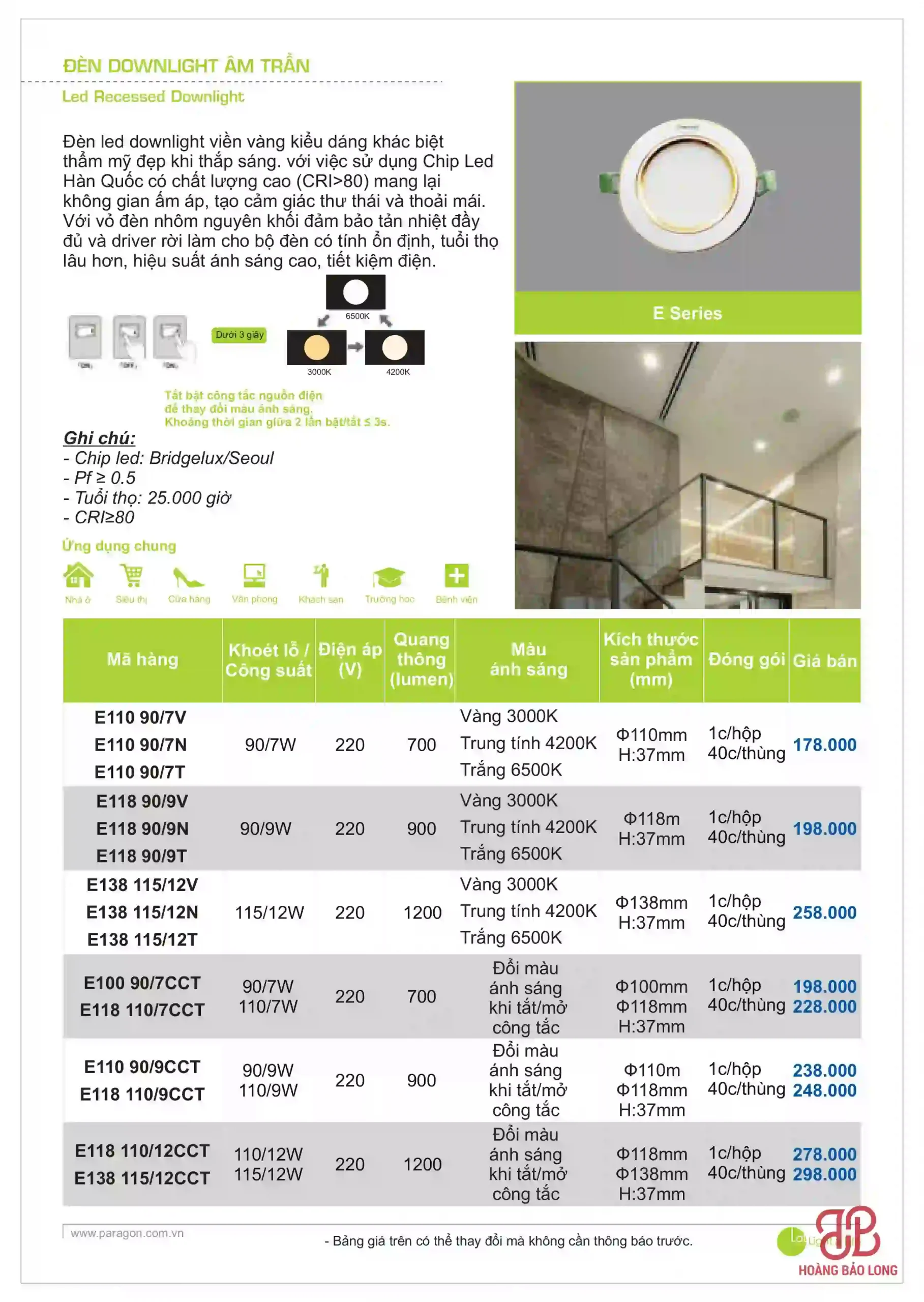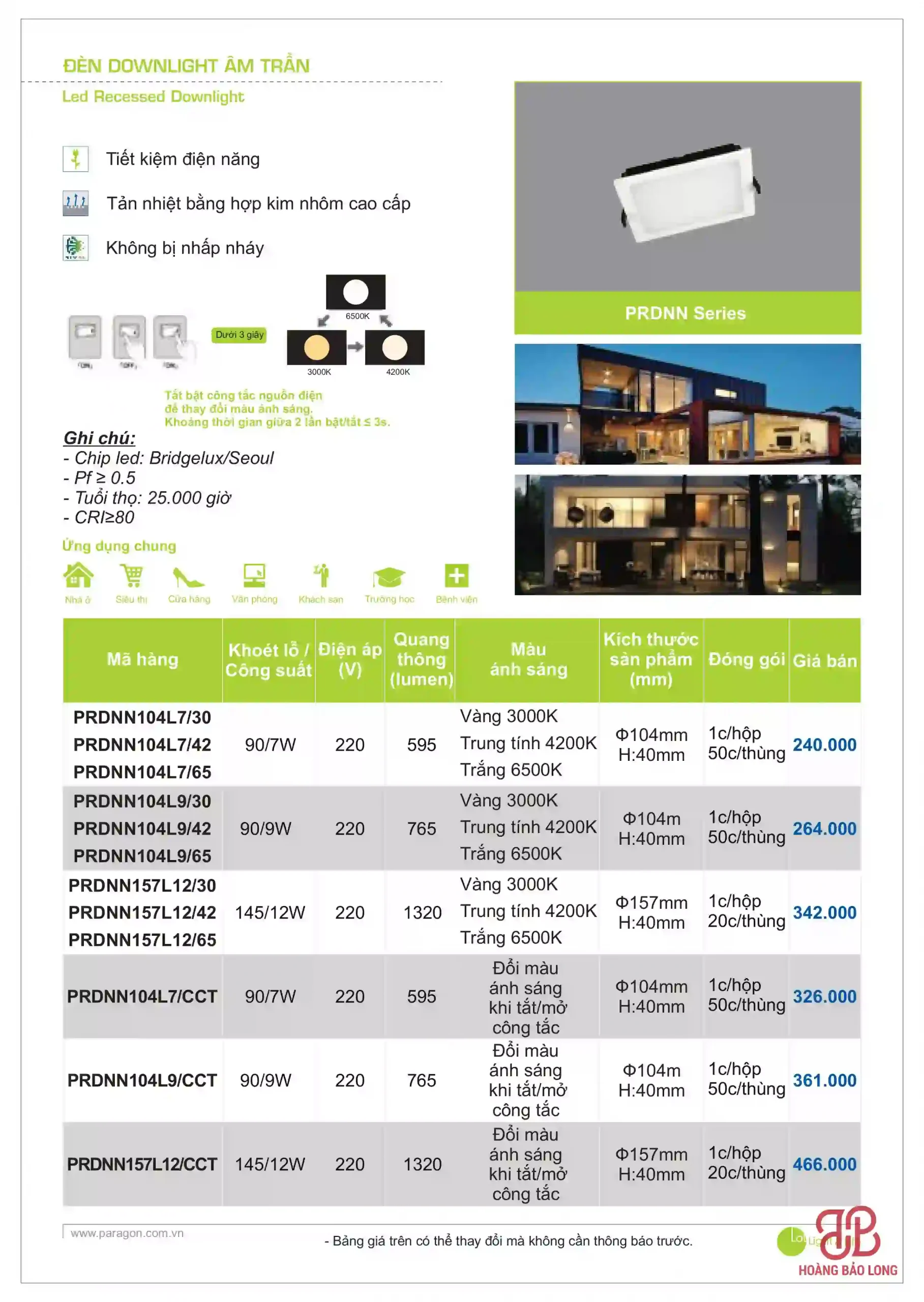 Đèn LED âm trần Paragon (hay còn gọi là LED Recessed Downlight) là dòng sản phẩm chiếu sáng chủ lực được tin dùng tại nhiều công trình cao cấp nhờ sử dụng chip LED từ các thương hiệu danh tiếng thế giới. Với tuổi thọ bền bỉ và chất lượng ánh sáng vượt trội, Paragon khẳng định vị thế hàng đầu trong phân khúc chiếu sáng dân dụng. Tại Hoangbaolong.net, chúng tôi cập nhật liên tục bảng giá và các mẫu đèn mới nhất từ Catalogue tháng 6/2025.
