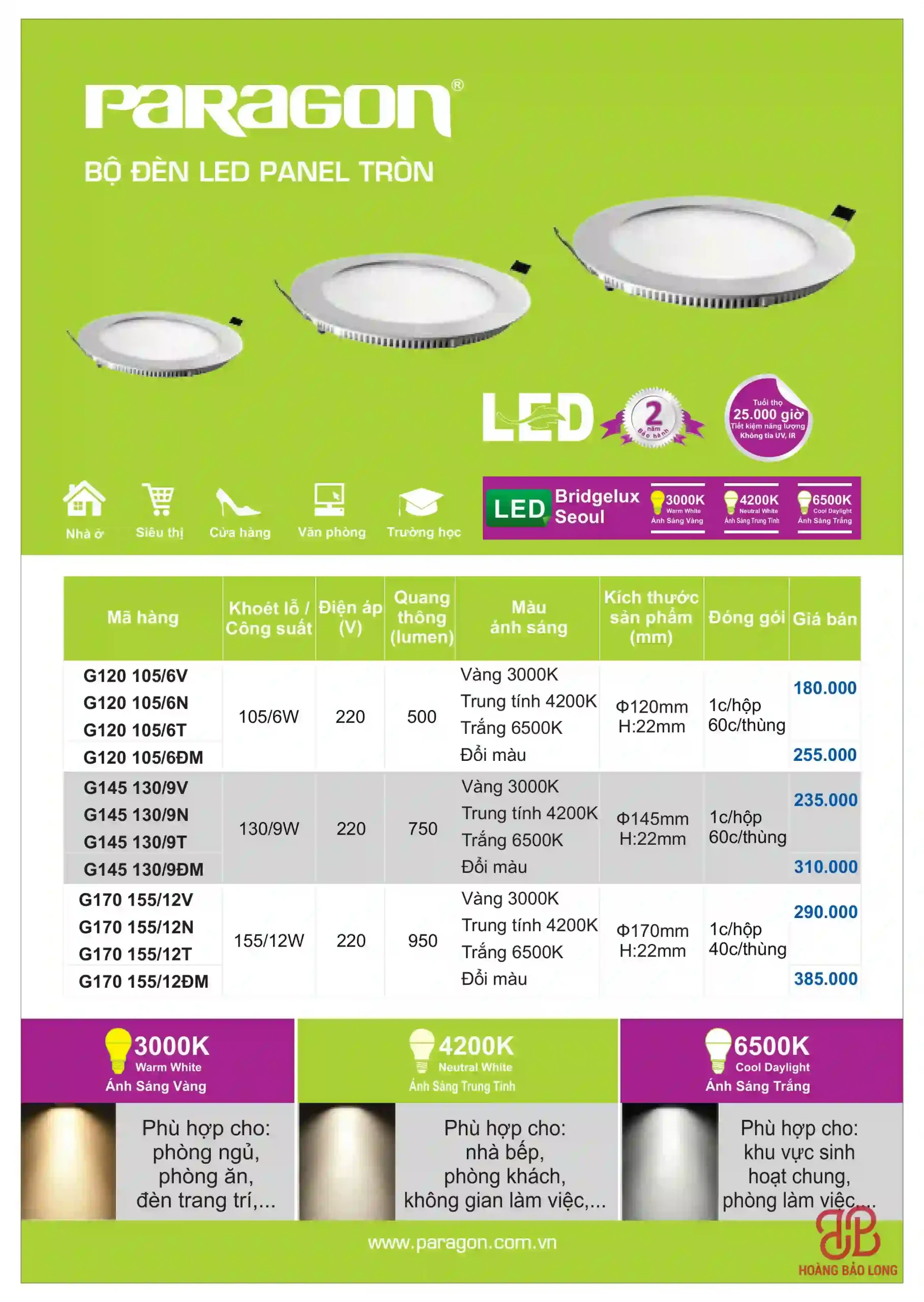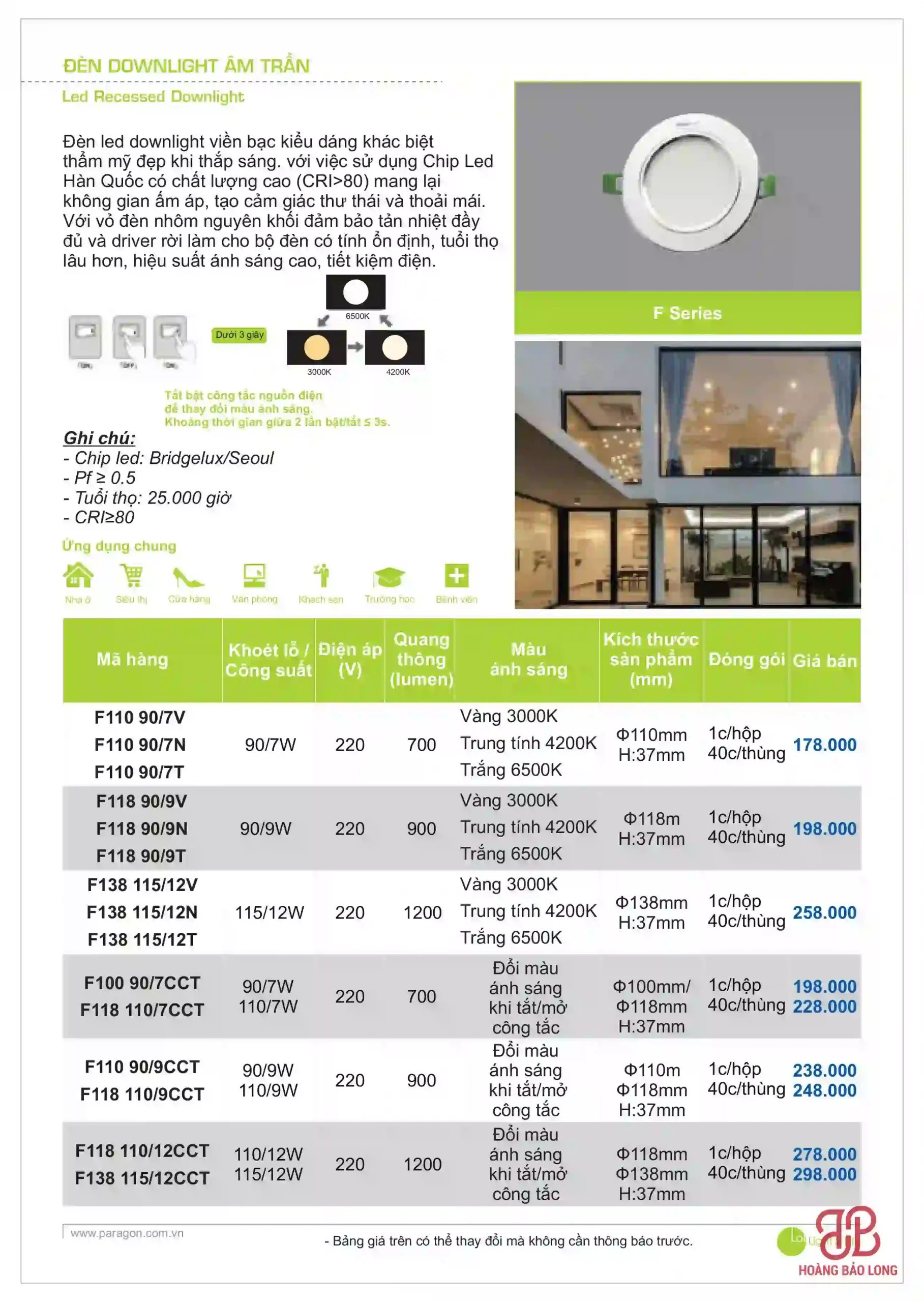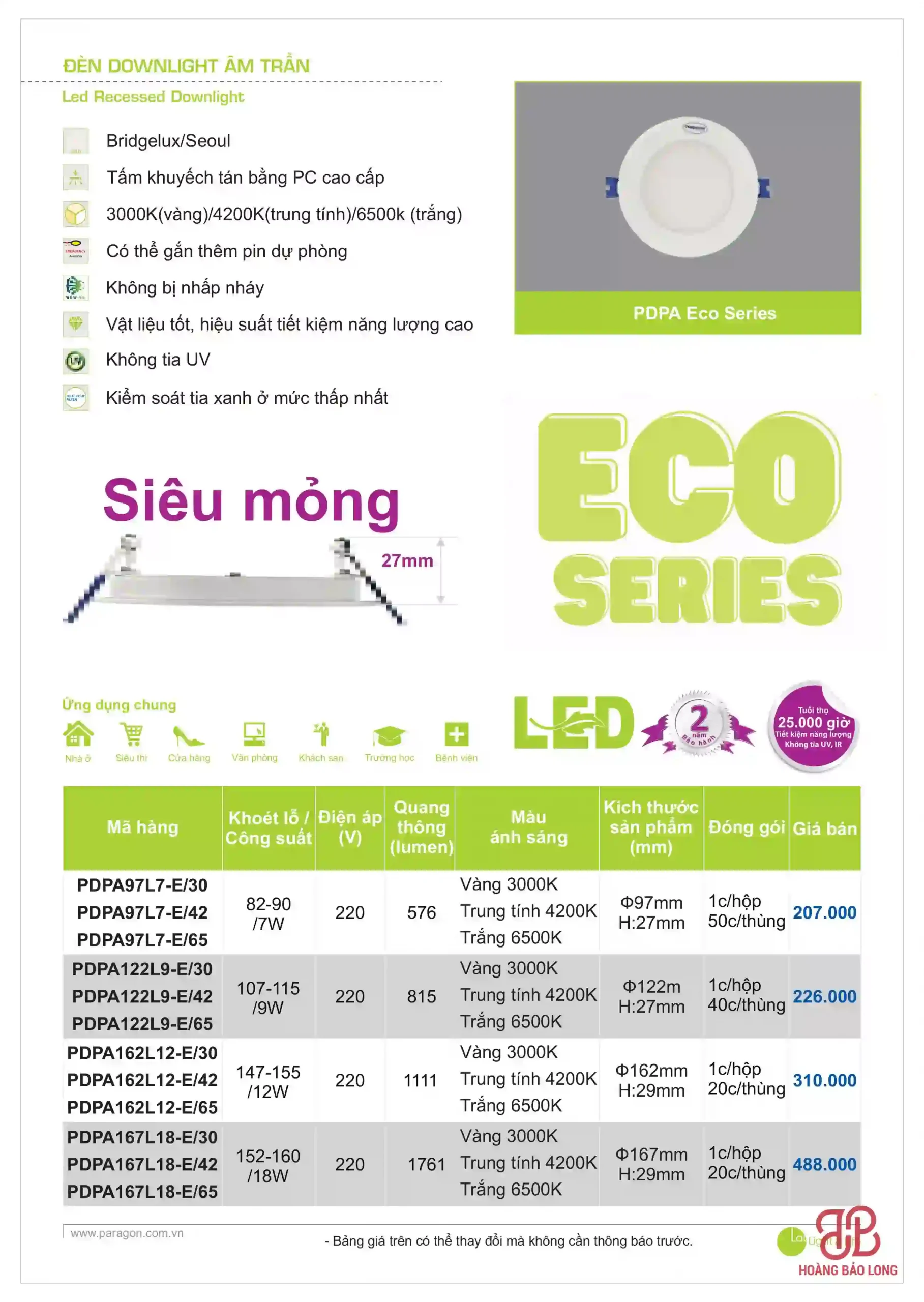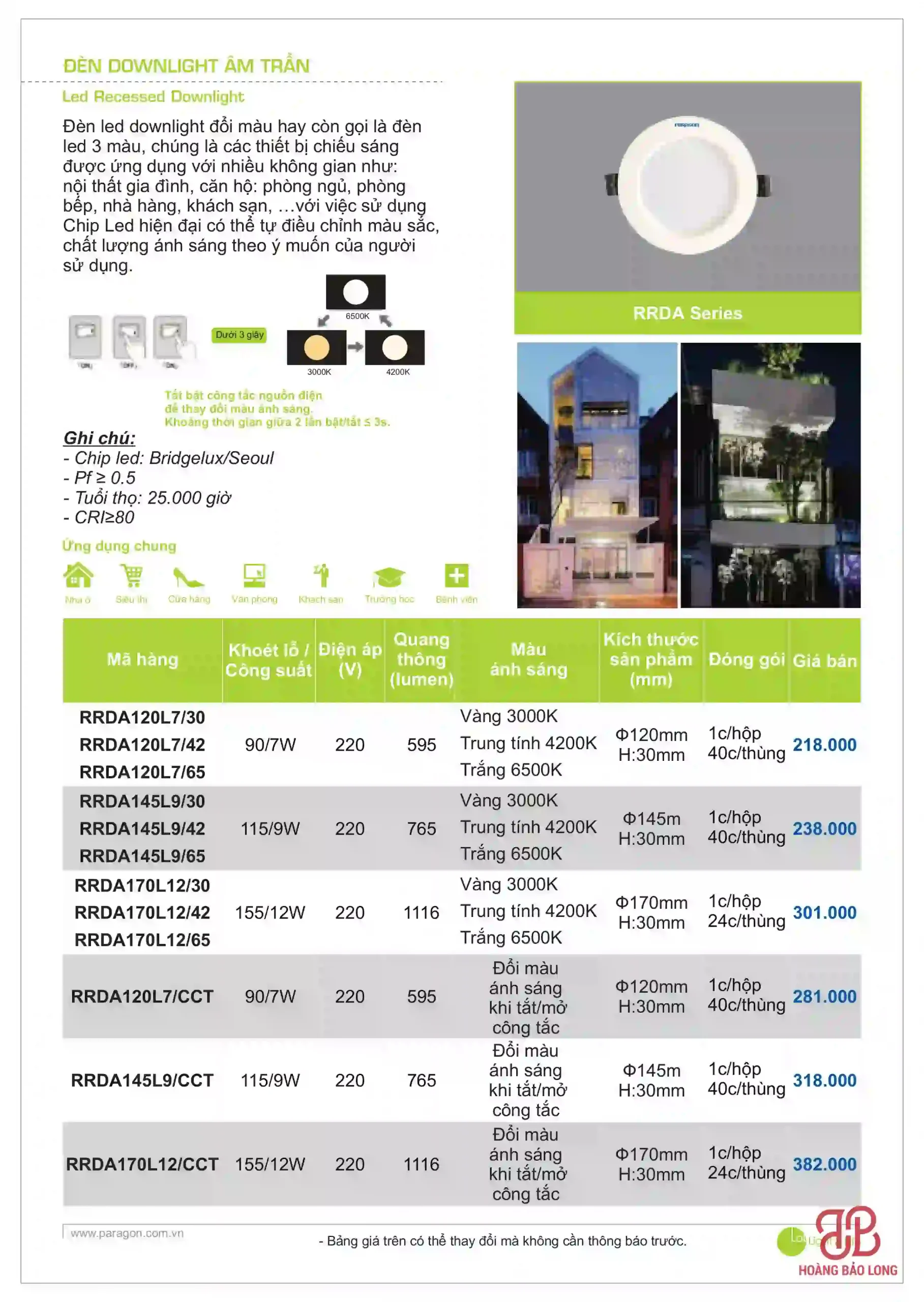Đèn LED âm trần Paragon (hay còn gọi là LED Recessed Downlight) là dòng sản phẩm chiếu sáng chủ lực được tin dùng tại nhiều công trình cao cấp nhờ sử dụng chip LED từ các thương hiệu danh tiếng thế giới. Với tuổi thọ bền bỉ và chất lượng ánh sáng vượt trội, Paragon khẳng định vị thế hàng đầu trong phân khúc chiếu sáng dân dụng. Tại Hoangbaolong.net, chúng tôi cập nhật liên tục bảng giá và các mẫu đèn mới nhất từ Catalogue tháng 6/2025.