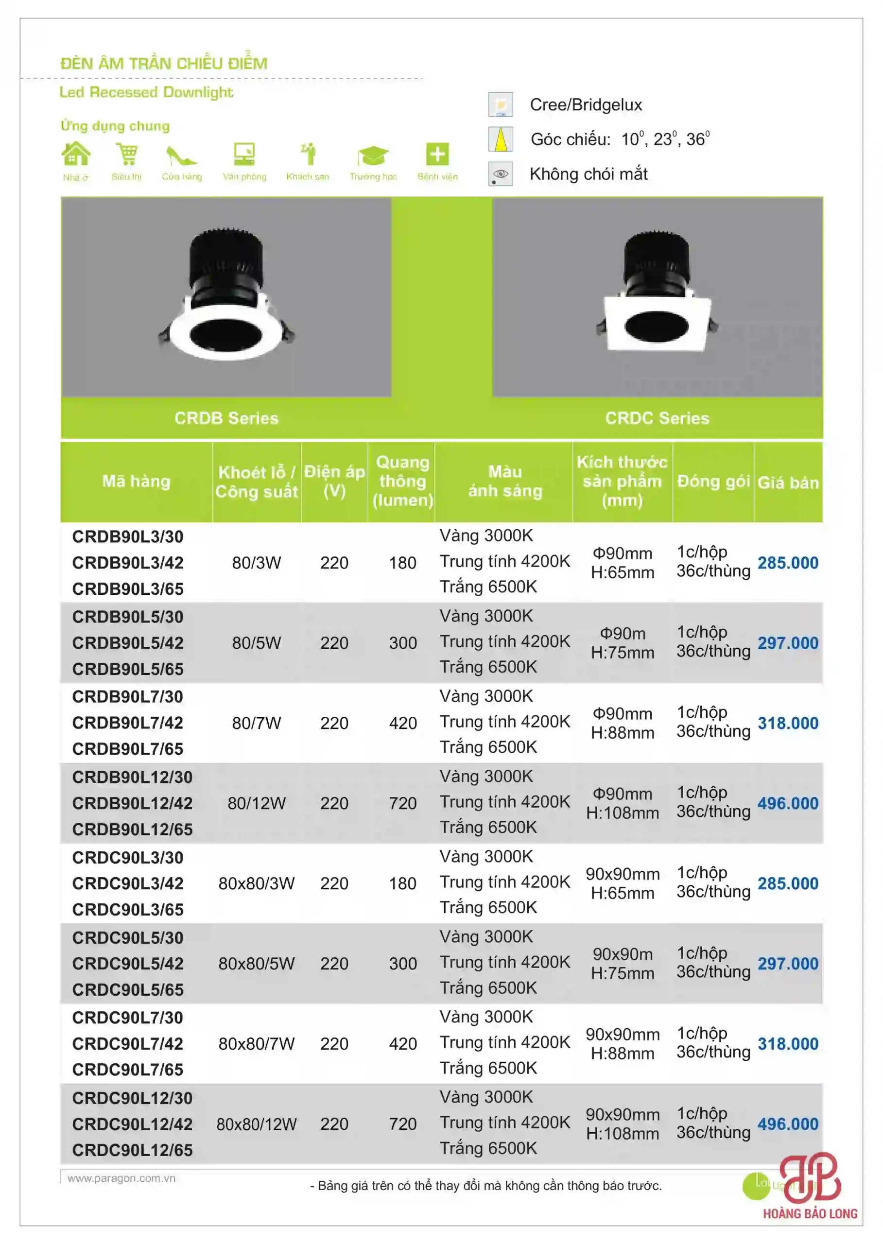 • Series CRDB (Chiếu điểm): Dòng Downlight Spotlight có góc chiếu hẹp (10°, 23°, 36°), dùng để tạo điểm nhấn cho tranh ảnh hoặc nội thất.