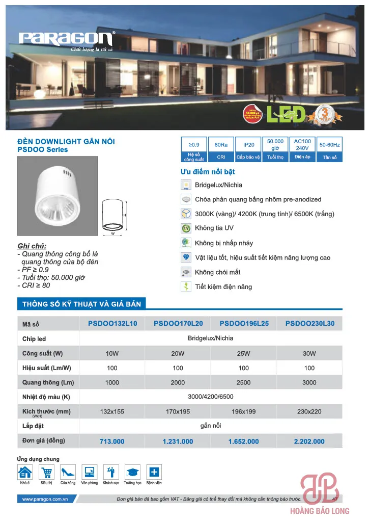 Hiệu suất cao: Một số dòng như PSDH đạt hiệu suất lên tới 130 Lm/W.