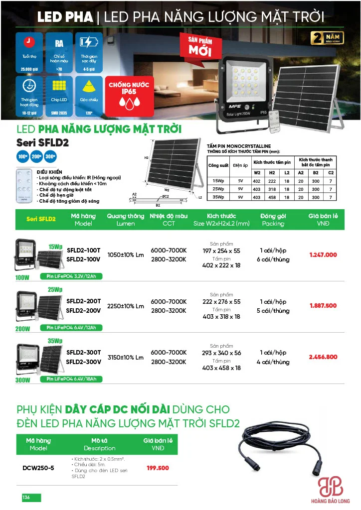 | Đèn năng lượng mặt trời MPE 200w | SFLD-200 | 4000lm | 35 Wp | 723x361x27 | 2.521.000đ |