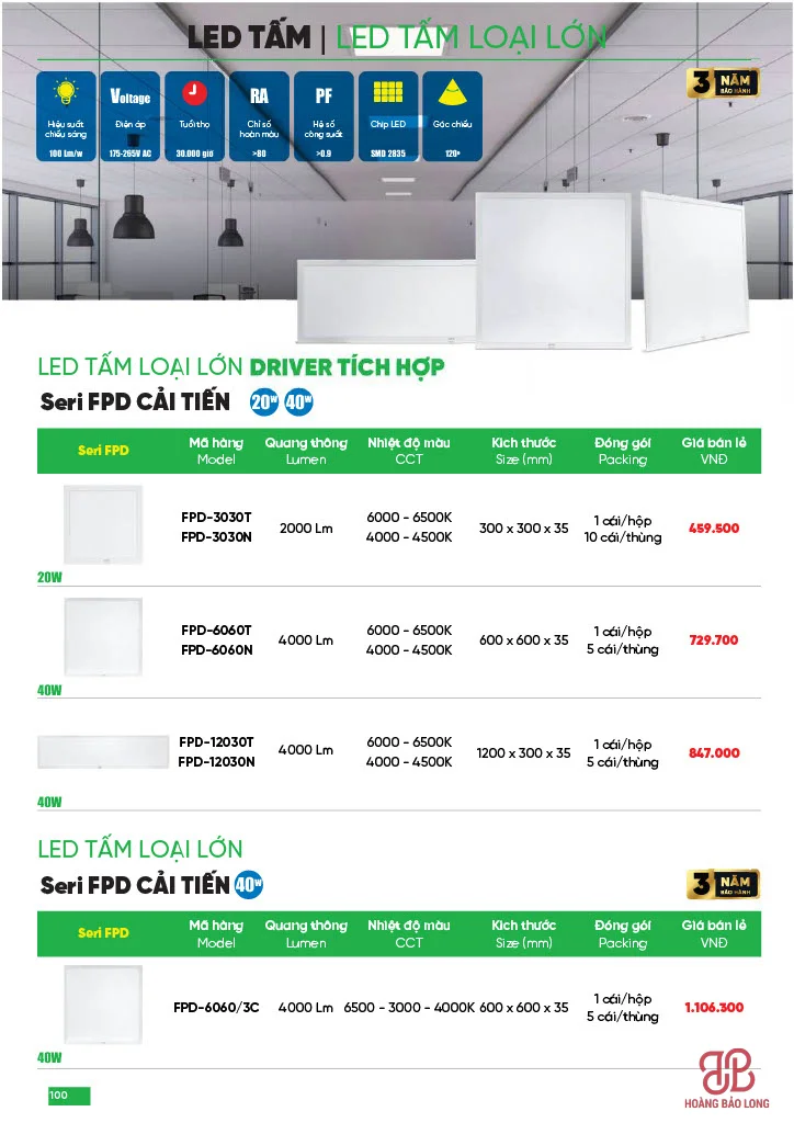 • Series FPD Cải tiến (40W): Công suất 40W, quang thông 4000 Lm. Dòng này có thêm phiên bản đổi 3 màu ánh sáng (6500K-3000K-4000K) mã FPD-6060/3C.