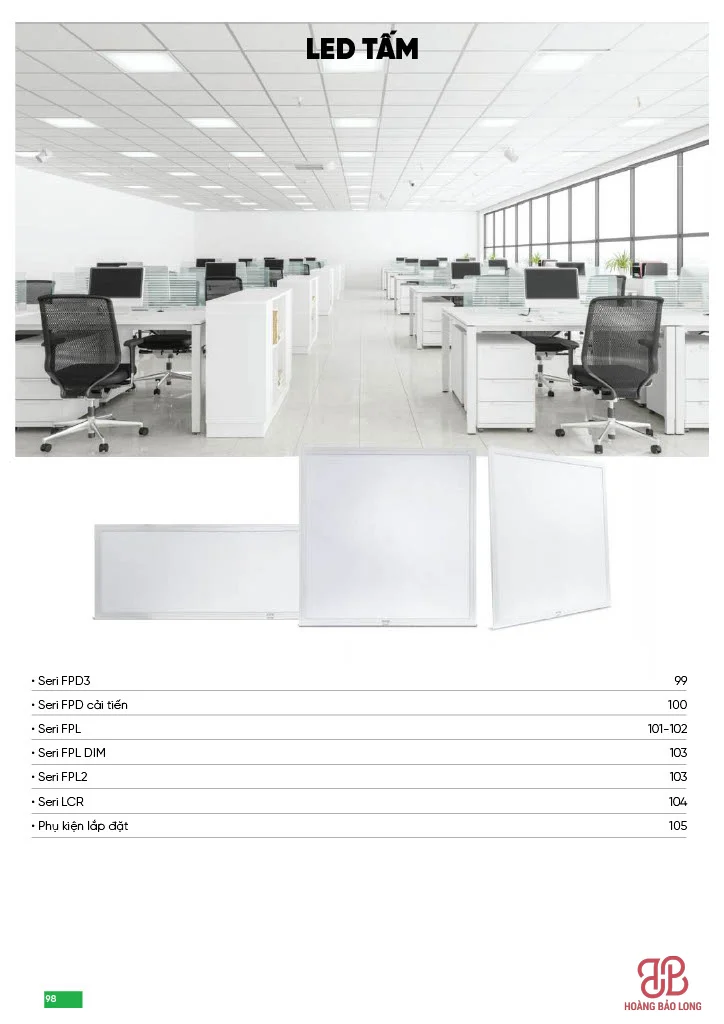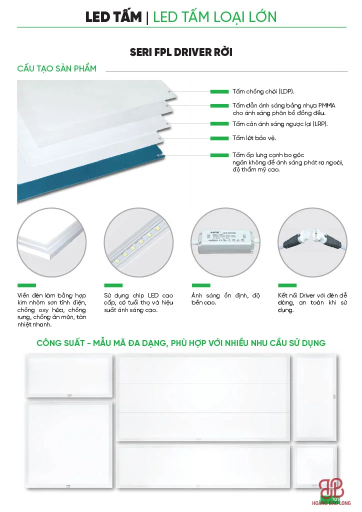 • Series FPL (Tiêu chuẩn – Driver rời): Dòng phổ thông với công suất 40W, quang thông 3600 Lm. Sản phẩm sử dụng tấm dẫn sáng PMMA cho ánh sáng phân bổ đồng đều.