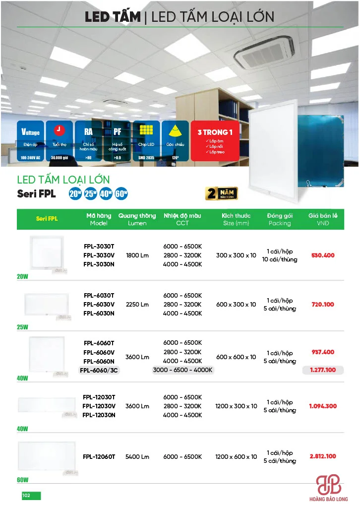 • FPL-12030T: Công suất 40W, quang thông 3600 Lm, sử dụng chip LED SMD 2835.