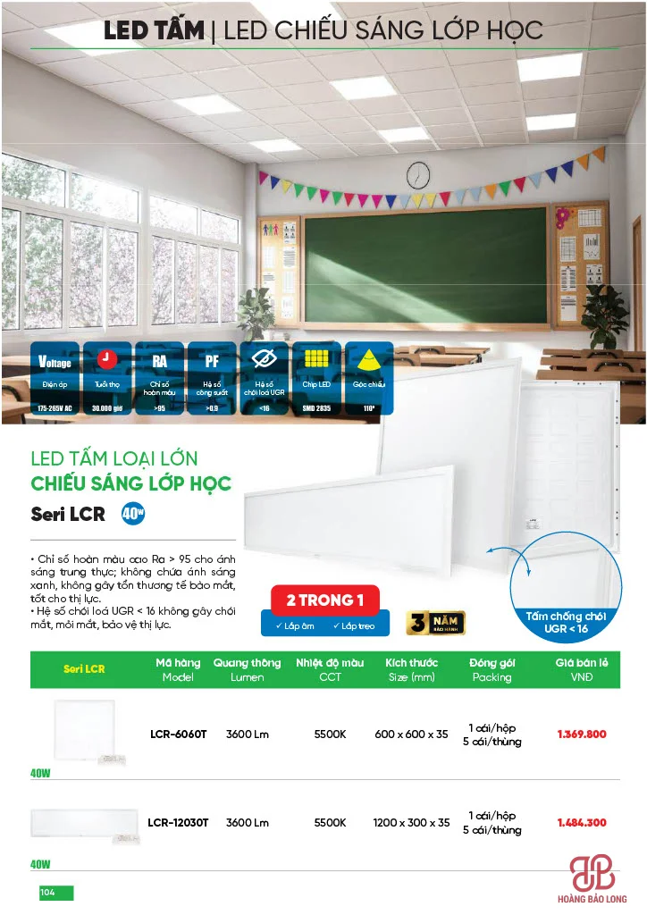 • Series LCR (Bảo vệ thị lực): Dòng chuyên dụng cho trường học với UGR < 16 (chống chói) và RA > 95, công suất 40W, quang thông 3600 Lm.