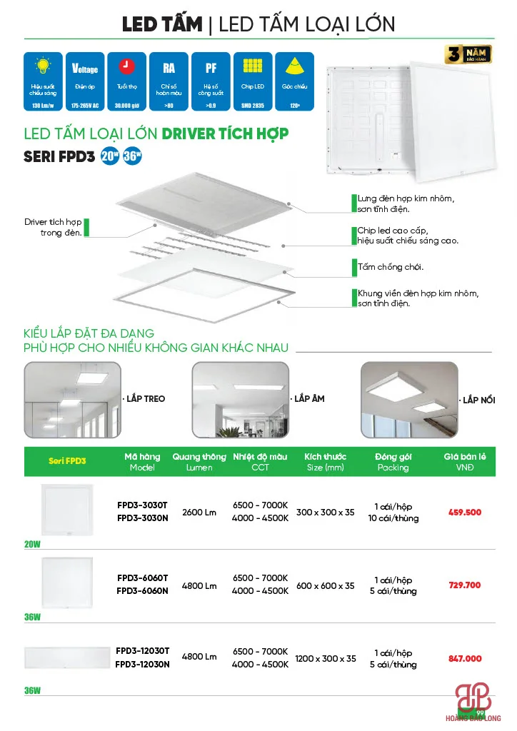 • Series FPD3 (Cao cấp – Driver tích hợp): Đây là dòng đèn siêu sáng với quang thông lên tới 4800 Lm dù công suất chỉ 36W (tiết kiệm điện hơn loại 40W thường). Driver được tích hợp bên trong đèn giúp thiết kế gọn gàng.