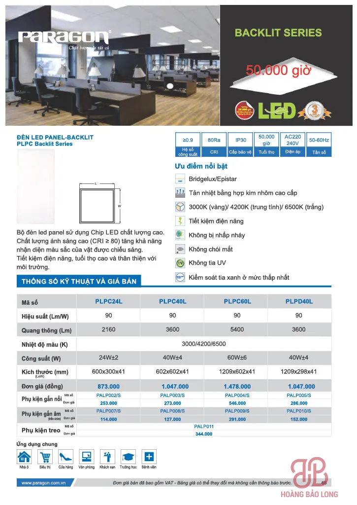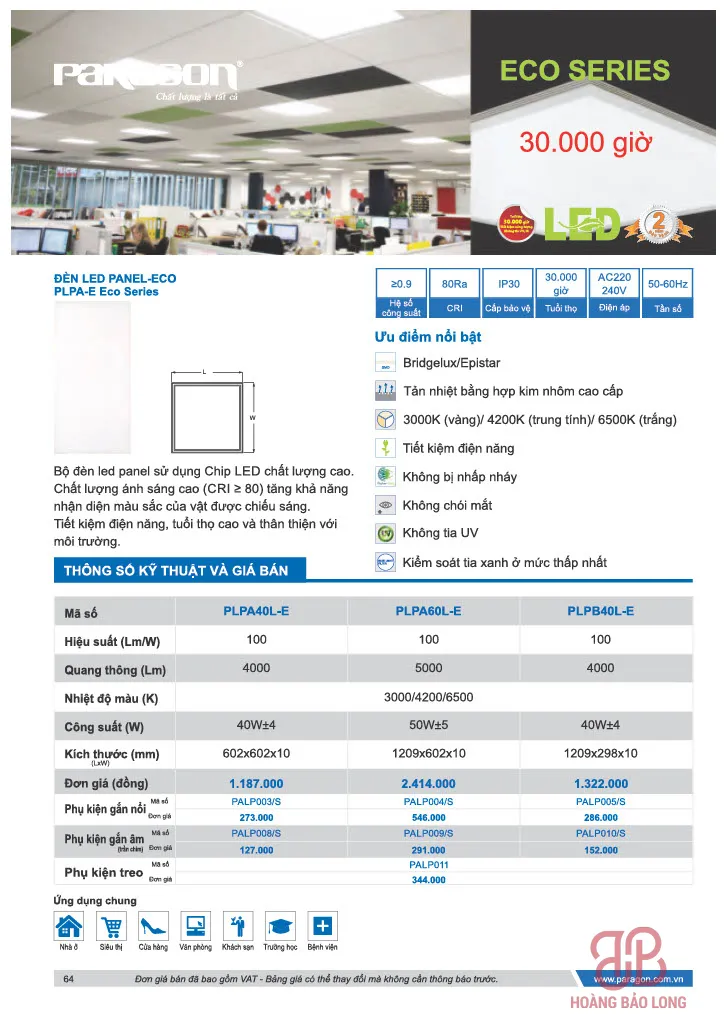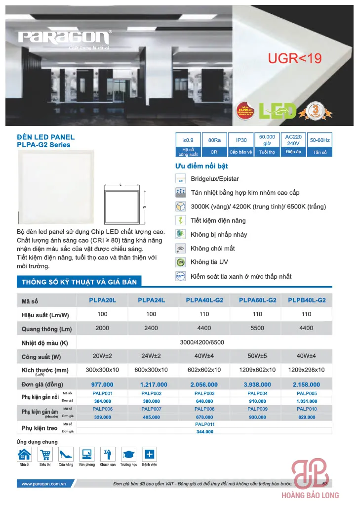 Hiện nay, Paragon đã nâng cấp hầu hết các dòng Panel 36W cũ lên công suất 40W để tăng hiệu suất sáng mà giá thành vẫn rất cạnh tranh. Dưới đây là bảng giá tham khảo một số mã thông dụng (bao gồm VAT):
