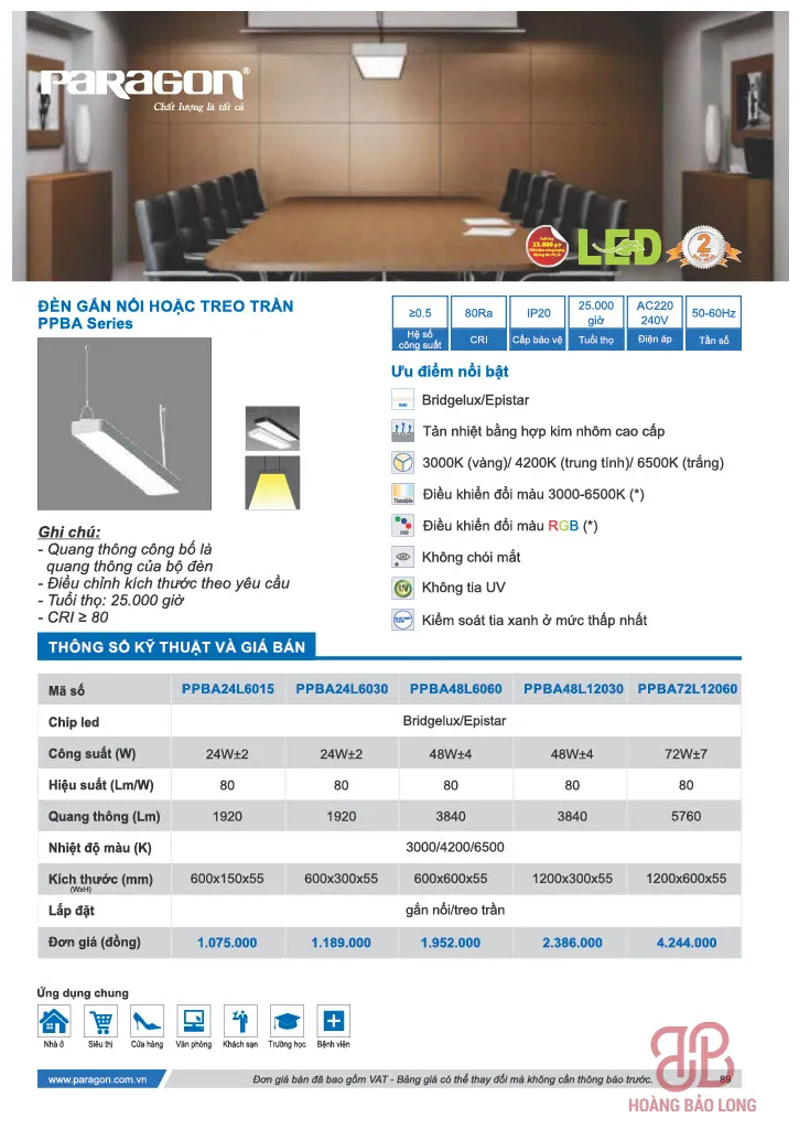 4. Bảng giá đèn LED thanh Paragon mới nhất 2025